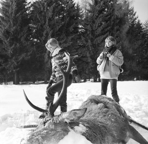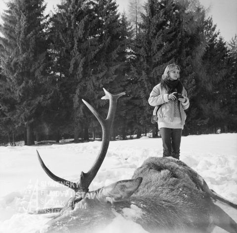 V popredí na snehu leží mŕtvy jeleň, vľavo Maria Probosz (redaktorka závodného časopisu Lenka Vanáková) a vpravo s fotoaparátom Adriana Tarábková (Erika Hambálková)