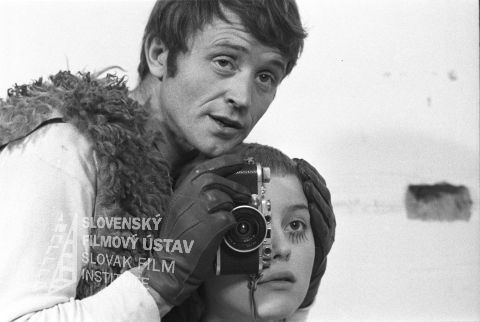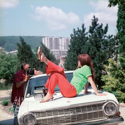 Pri aute vzadu s fotoaparátom stojí Miroslav Vojtek (Werner), na kapote auta sedí s preloženými nohami Štefánia Minárová (Bibiána), na kapote aute je položené i rádio
