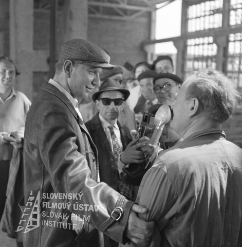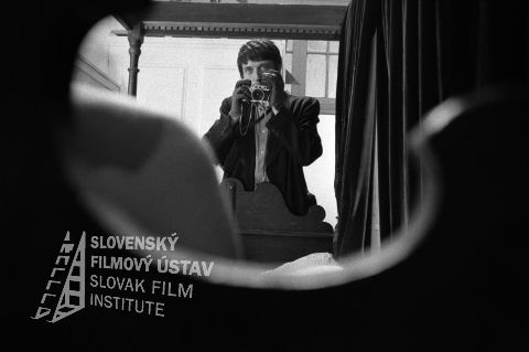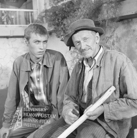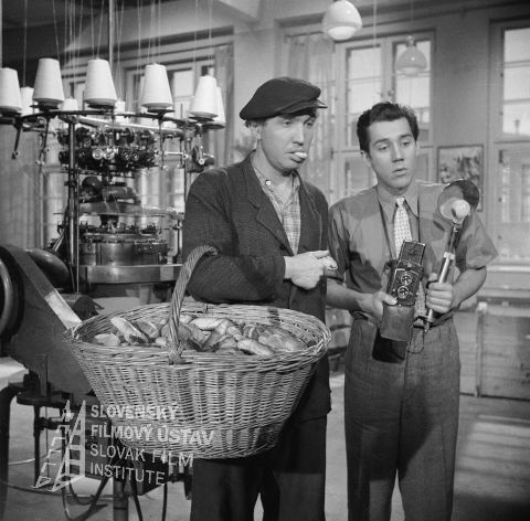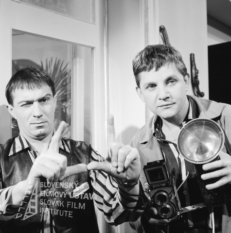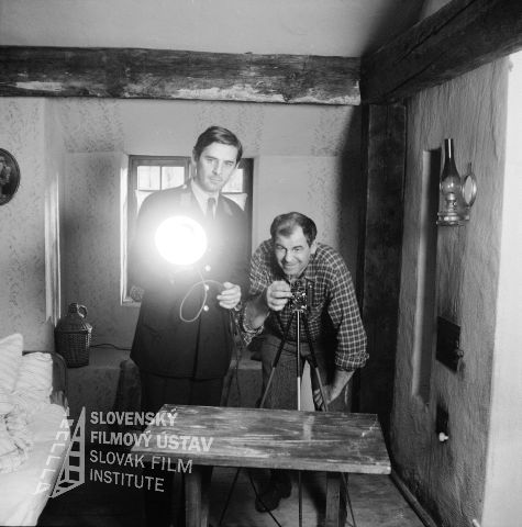 Vľavo stojí a drží v ruke rozsvietenú lampu Ivan Mistrík (Oto Brunner, vlastným menom Hans Klaus), vpravo sa skláňa nad fotoaparátom Ivan Rajniak (Ivan Vendoš)