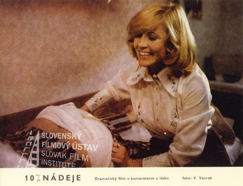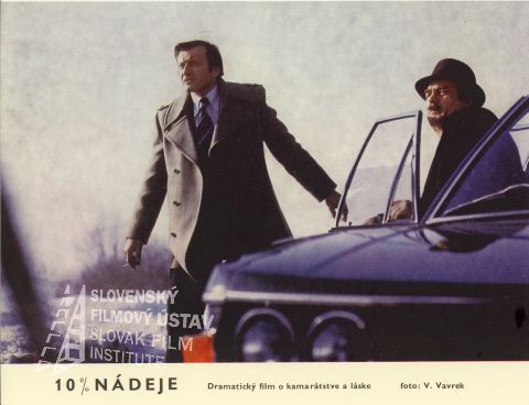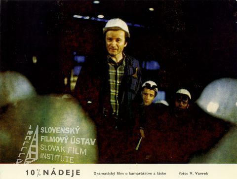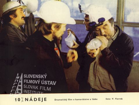 Vľavo stojí Pavel Landovský (Milan Papiež), vpravo stojí Július Pántik (Ďuro Hronček), za ním stojí Jan Tříska (Maťo Pompura), muž v popredí v strede (?), všetci muži majú na hlavách biele helmy