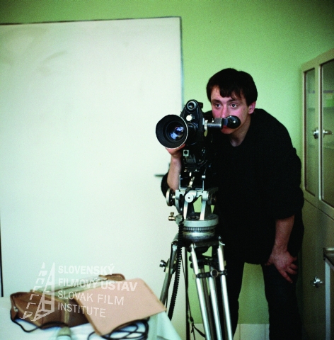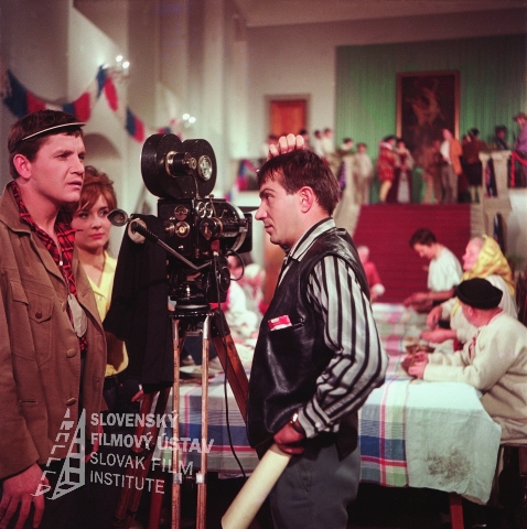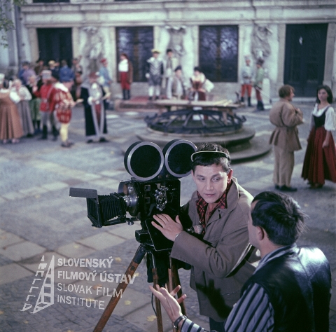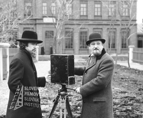 Negatív fotografie z filmu Odhalenie Alžbety Báthoryčky (1965). Zľava: Lubomír Hrůza (Oliver Poljaček), Josef Hajdučík (kameraman Pepo) a Zora Kolínska (klapka Božena).
